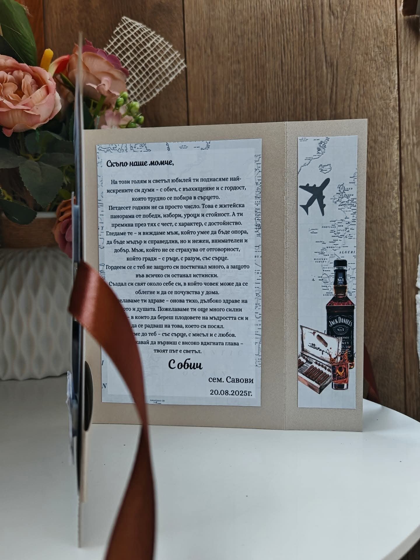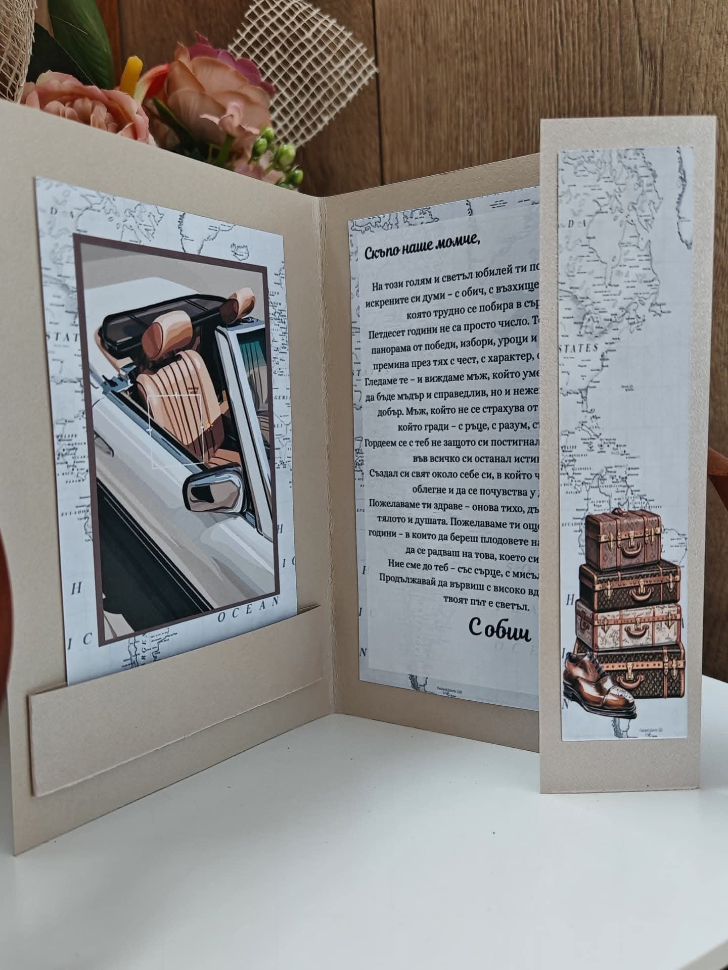 Картичка, която не е претрупана с думи, а носи уважение и стил. Подарък, който стои добре до всеки мъжки жест и остава като спомен.