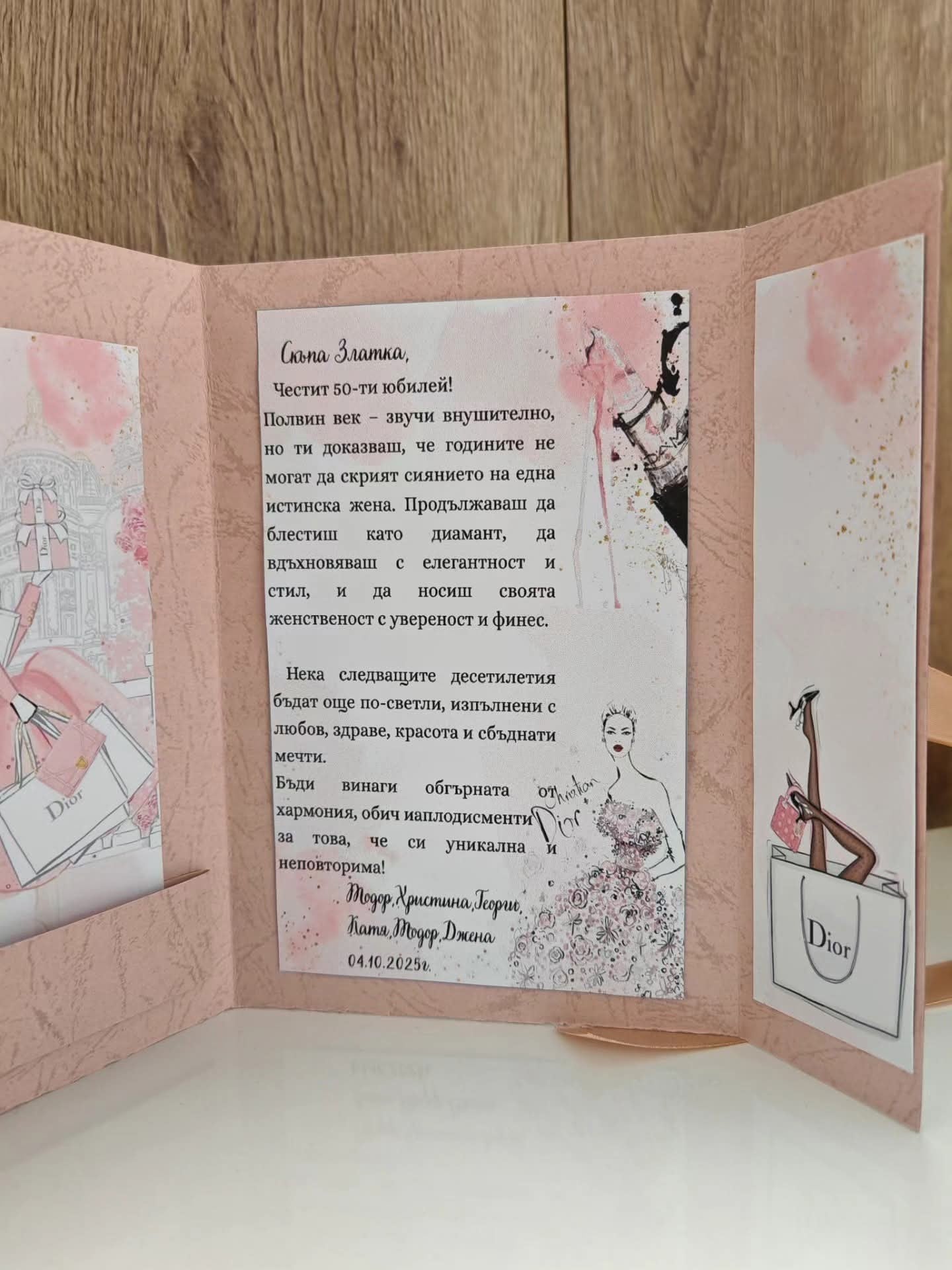 Създадена изцяло на ръка, с внимание към всеки детайл, тази персонална картичка е вдъхновена от вечната елегантност на стил Dior – изчистени линии, благородни цветове и усещане за лукс без показност. Подходяща за рожден ден или юбилей на жена, която знае коя е, цени себе си и оставя следа.