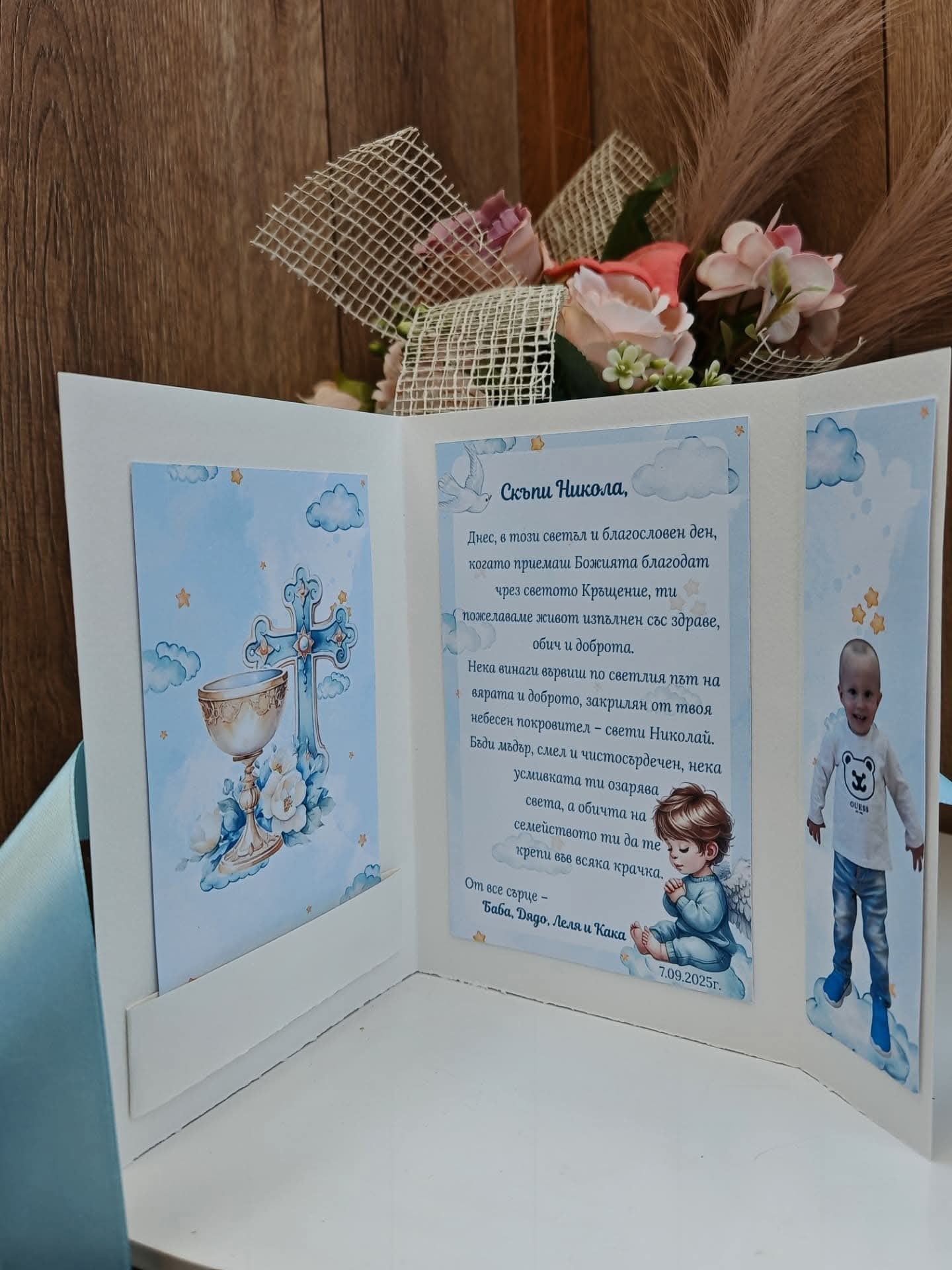 Картичката предлага възможност за персонализация, включваща името на детето, датата на кръщението и лично послание от родители, кръстници или близки. По желание може да бъде добавена и снимка на момченцето, което превръща картичката в ценен спомен с дълготрайна емоционална стойност.