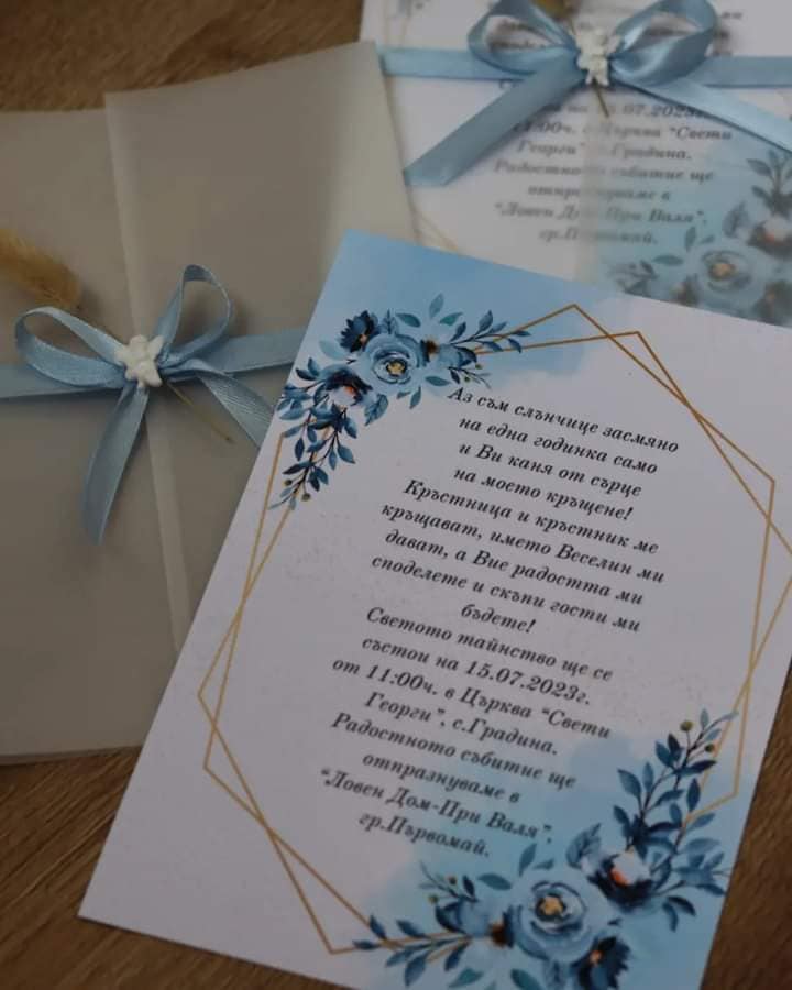 - Дизайн: Стилни и елегантни покани, изработени от висококачествен картон и оризова хартия, в изискани сини цветове.