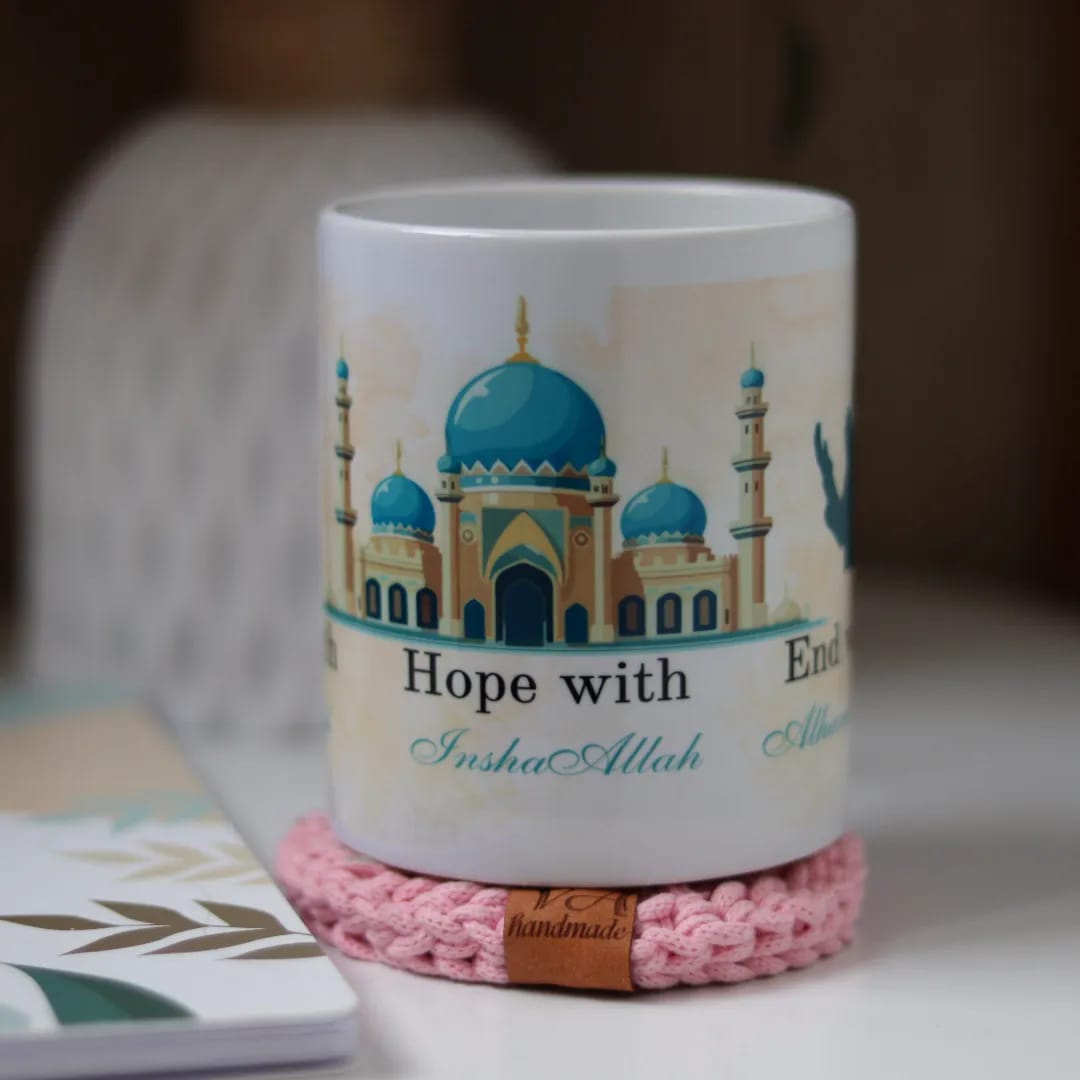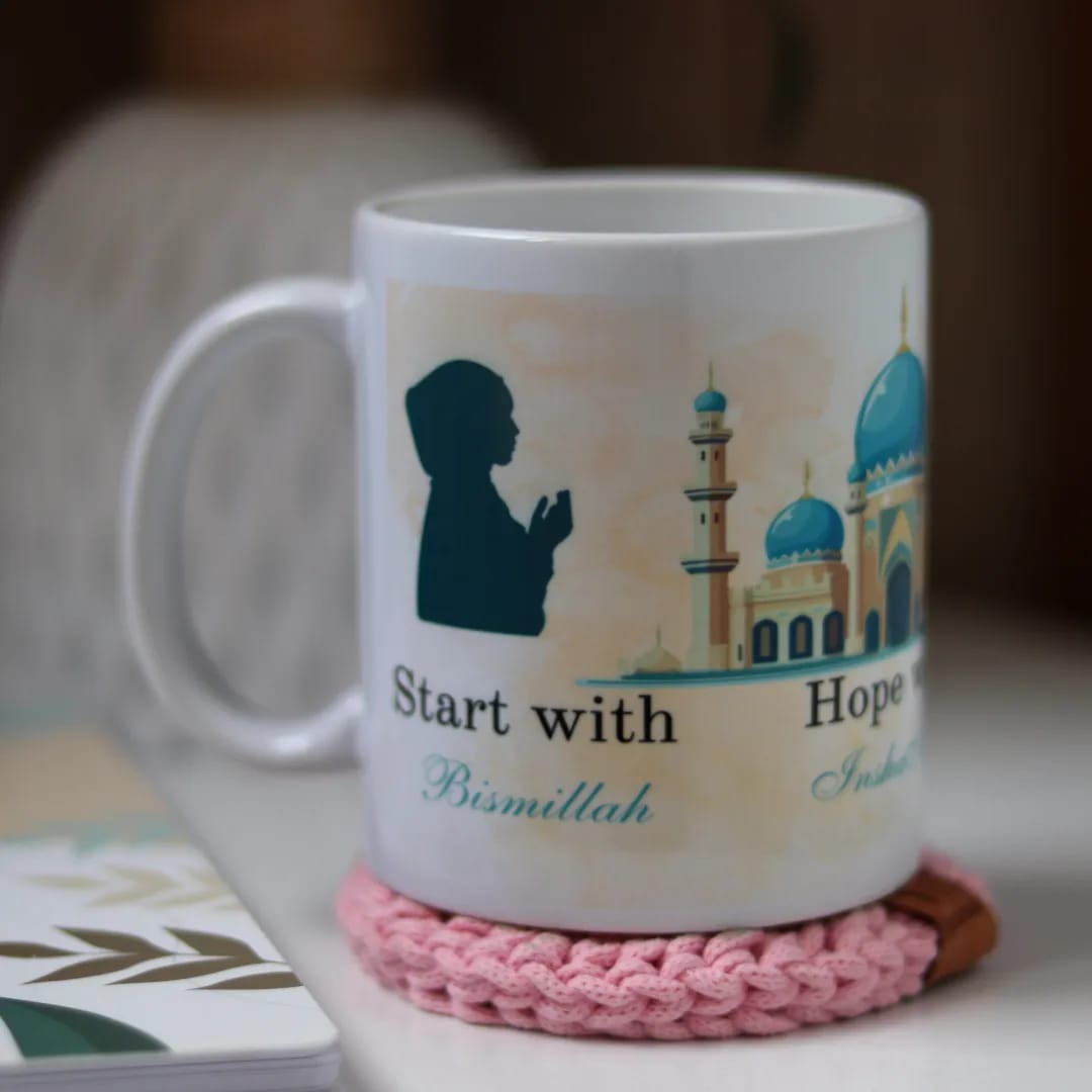 - Вдъхновяващ дизайн: Чашата е декорирана с красив дизайн, включващ ислямски символи и вдъхновяващи послания, които припомнят за духовното значение на новия ден.